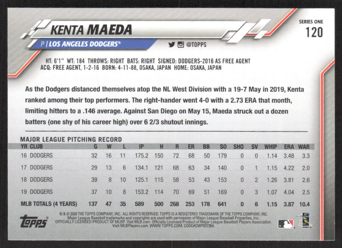 2020 Topps Los Angeles Dodgers LAD-10 Kenta Maeda